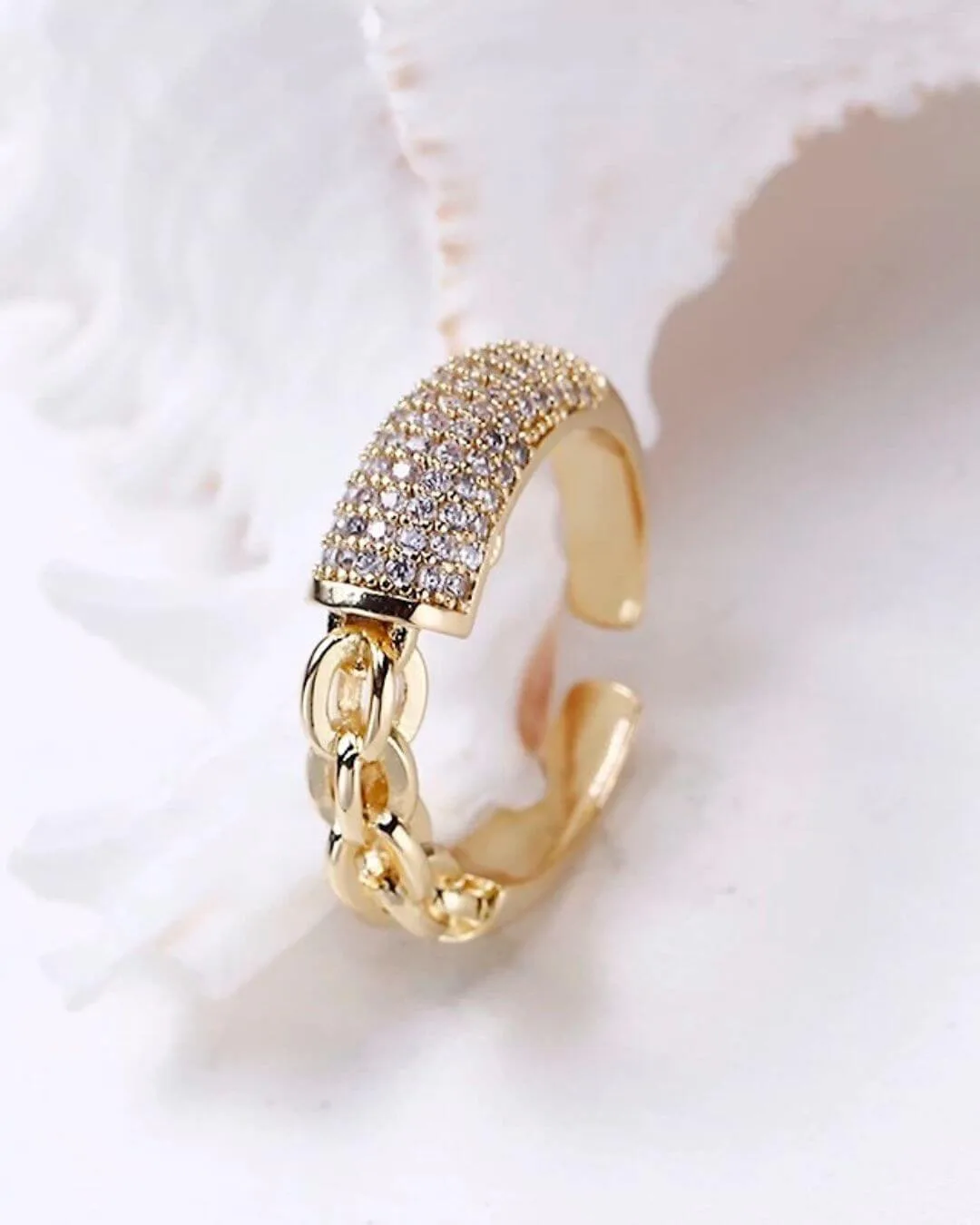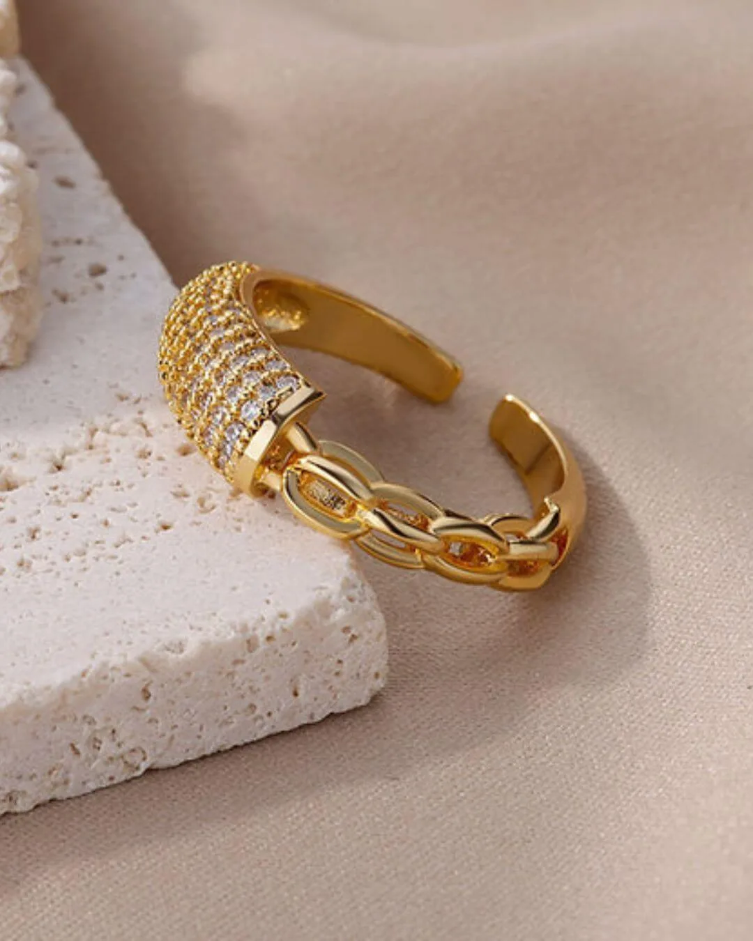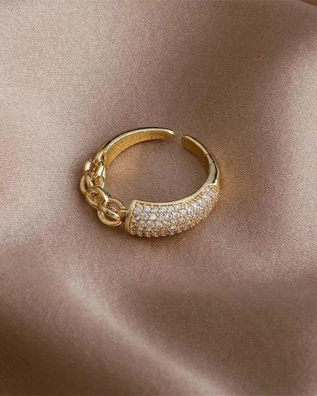 Anillo hecho de acero quirúrgico hipoalergénico con baño de oro 18k y zirconias.Su talle es regulable.